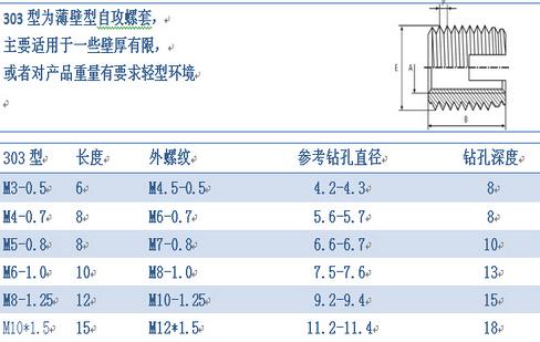 薄壁型营口自攻螺套外观上看主要有两种区分,一种是一端开槽型的,另一种是一端三圆孔型的,其中开圆孔型的又分为307型和308型两种,307型和308型外观主要区别就是同一直径下,长度和外径大小有所区分。以上各种型式螺套均具有自行攻牙功能。